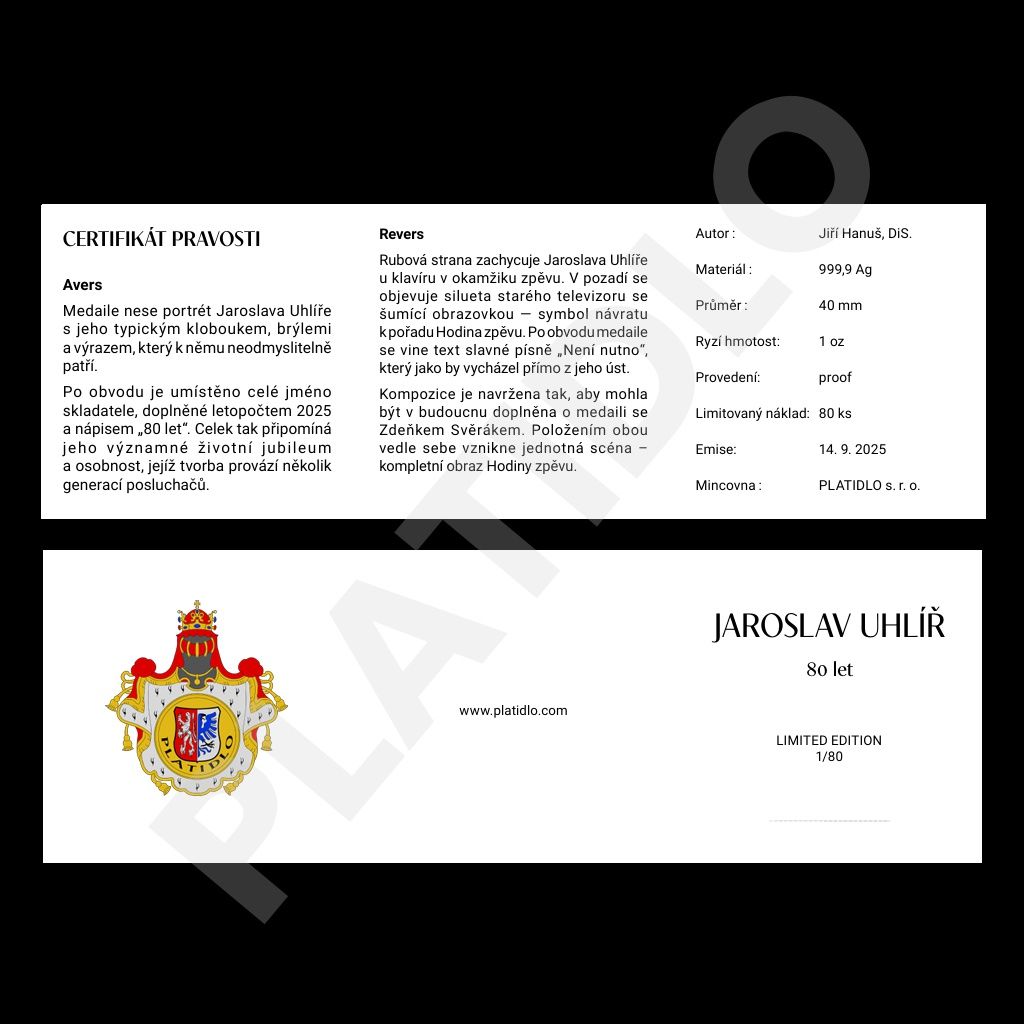 Společnost PLATIDLO.COM s hrdostí představuje exkluzivní stříbrnou medaili vydanou k příležitosti 80. narozenin hudební legendy Jaroslava Uhlíře. Emise medaile proběhla slavnostně dne 14. 9. 2025, symbolicky v den jeho životního jubilea.